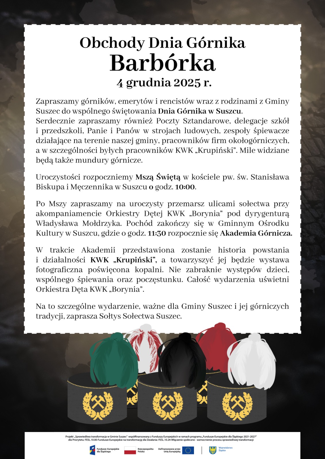 Serdecznie zapraszamy na tradycyjne Obchody Dnia Górnika – Barbórki, które odbędą się 4 grudnia 2025 r.  Wydarzenie realizowane jest w ramach Inicjatywy Lokalnej Grzegorza Dera.