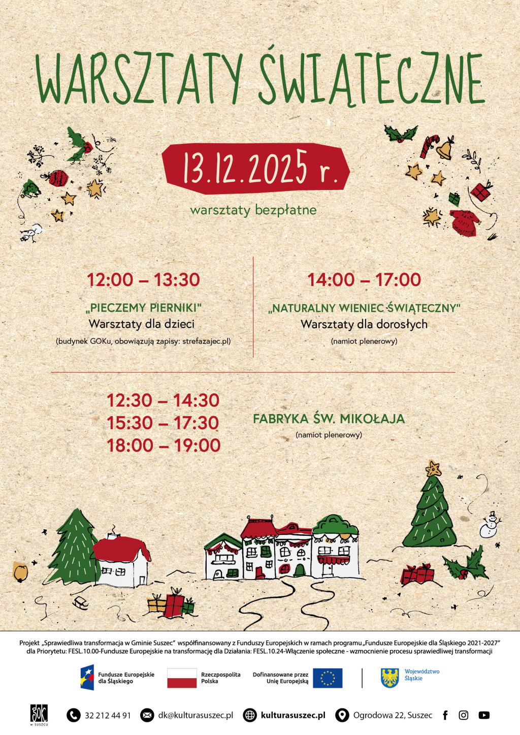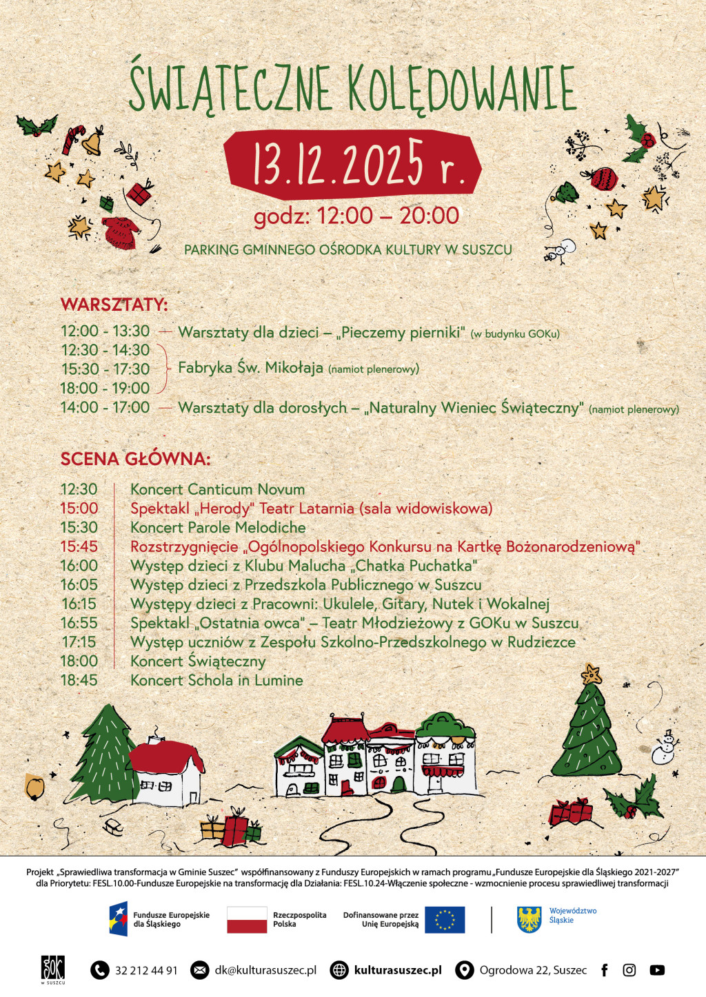 Zapraszamy na plenerowy Jarmark Świąteczny i Świąteczne Kolędowanie, które odbędą się 13 grudnia 2025 r. od godz. 12:00 do godz. 20:00 na parkingu Gminnego Ośrodku Kultury w Suszcu.