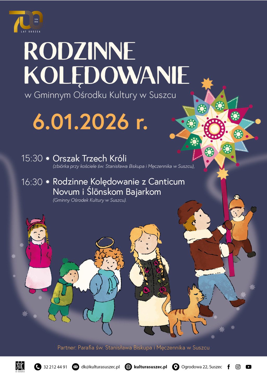 Rodzinne Kolędowanie odbędzie się 6 stycznia 2026 r. i rozpocznie o godz. 15:30 Orszakiem Trzech Króli (spod suszeckiego kościoła).Udział w wydarzeniu jest bezpłatny. Zachęcamy do przygotowania strojów kolędniczych podczas Orszaku Trzech Króli.
