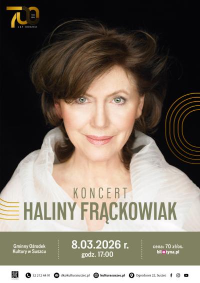 W ramach Dnia Kobiet zapraszamy Państwa na koncert Haliny Frąckowiak. Podczas koncertu artystka zaprezentuje swoje największe przeboje jak: „Idę dalej”, „Bądź gotowy dziś do drogi”, „Napisz proszę”, „Papierowy księżyc”, „Mały elf” – a to tylko niektóre z nich!